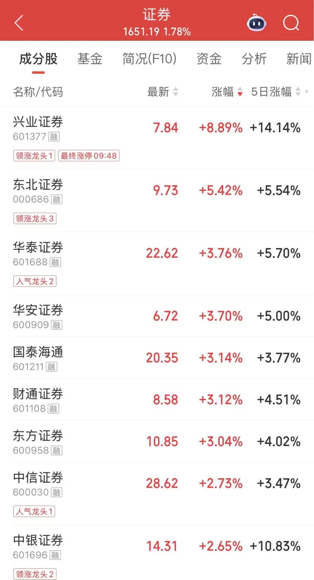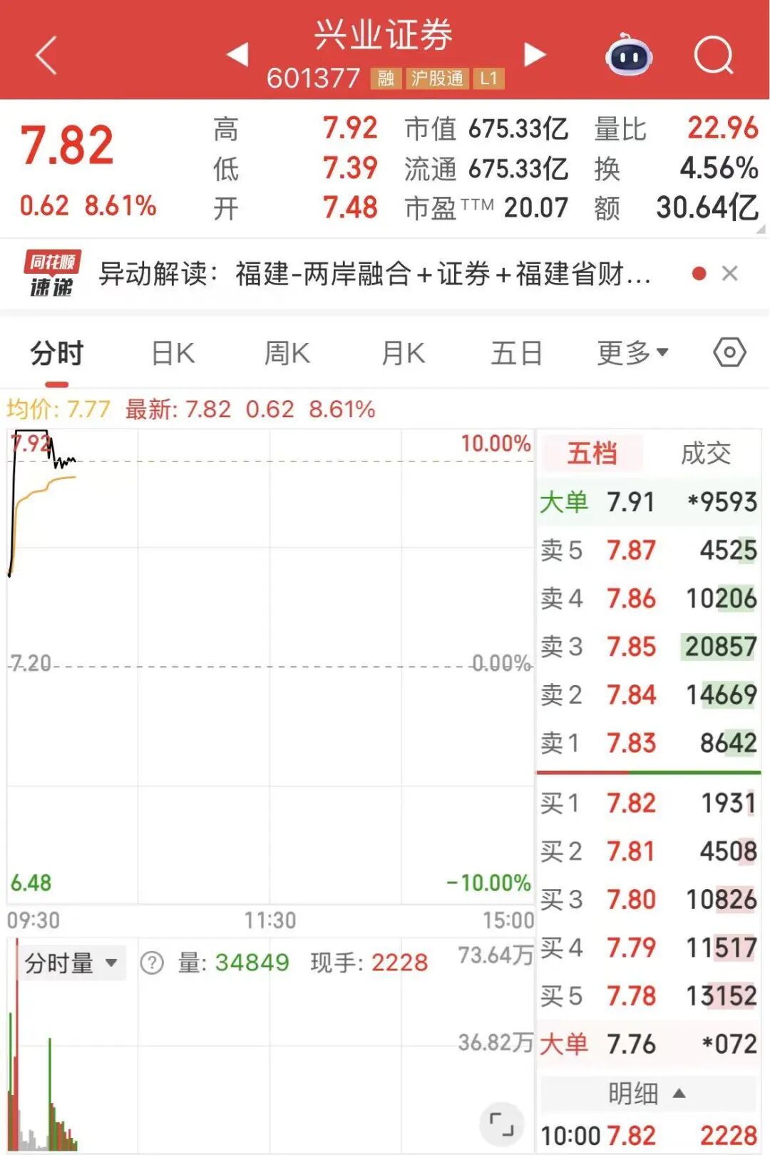 证券板块开盘走高,兴业证券(601377)开盘后快速拉升,三分钟涨停,随后打开涨停板,截止发稿创达盈配资,涨超8%。东北证券、华泰证券、华安证券、国泰海通跟涨。