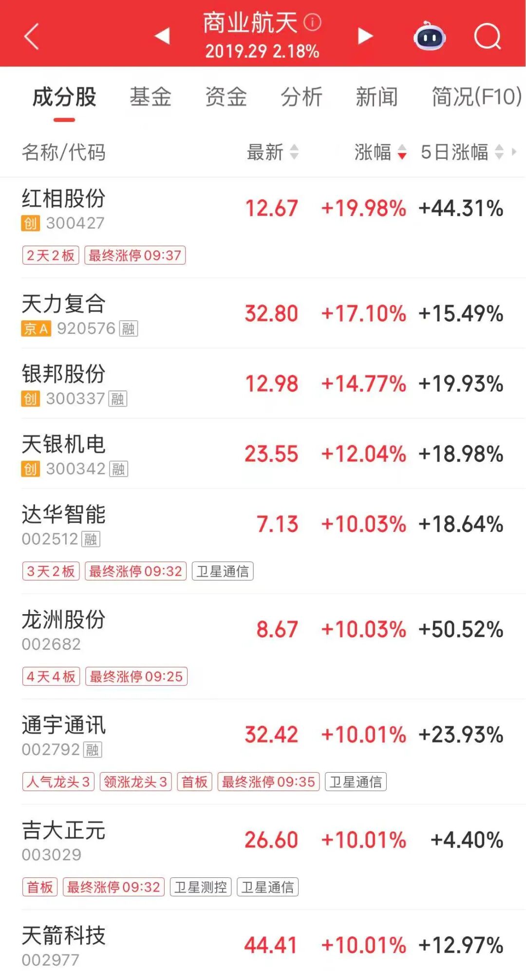 商业航天板块持续走高,红相股份(维权)“20cm”涨停,达华智能(维权)、龙洲股份、通宇通讯、吉大正元、天箭科技等多股涨停,天力复合、银邦股份、天银机电涨幅居前。